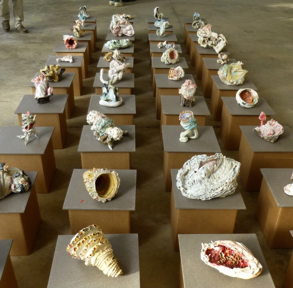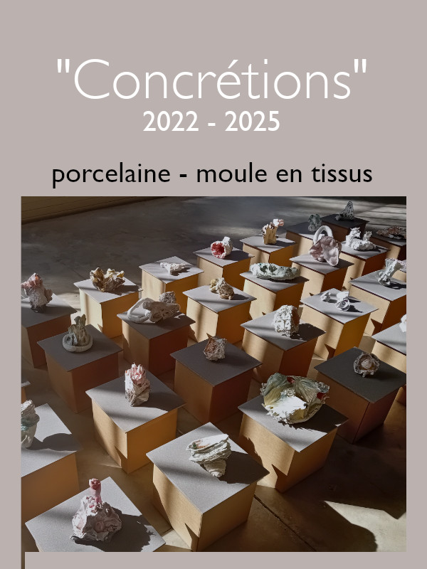 Recherches de porcelaine coulée dans des moules en tissus, processus qui inverse les formes et suscite l’aléatoire. Dans cette série, une nature hybride entre organique et minérale opposant mou gluant lisse et rugueux rêche anguleux.