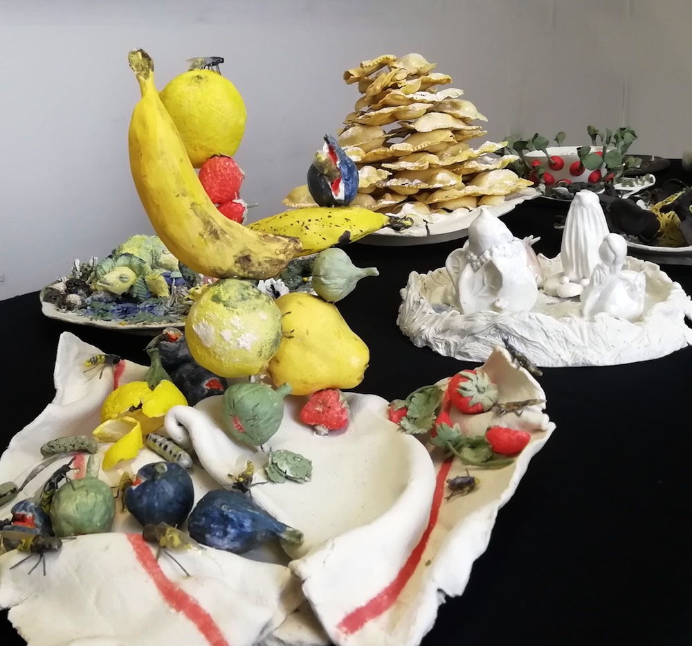 Dans ce travail je me suis intéressée à notre rapport à la nourriture, à ses légendes et à ses récits singuliers. Les aliments que j’ai retenu deviennent alors des prétextes pour raconter des histoires en référence à des mythes, des symboles ou des histoires familiales. Cette narration a pris forme dans une installation composée de treize assiettes en trompe-l’œil. Des radis qui passent au travers de la céramique du bol… Des fruits en décomposition jouant aux équilibristes… Une tour de Babel en bugnes qui menace de s’écrouler…